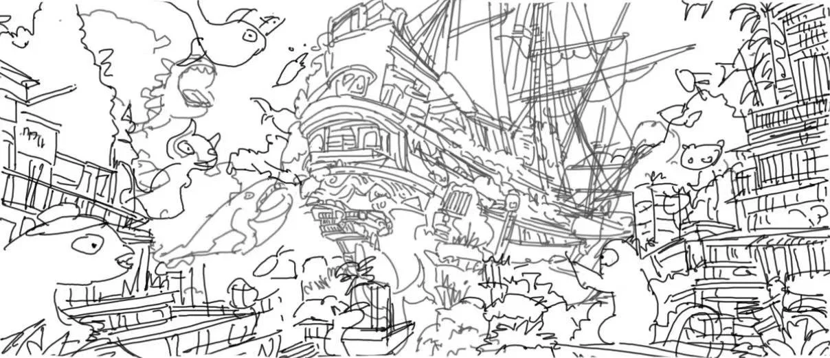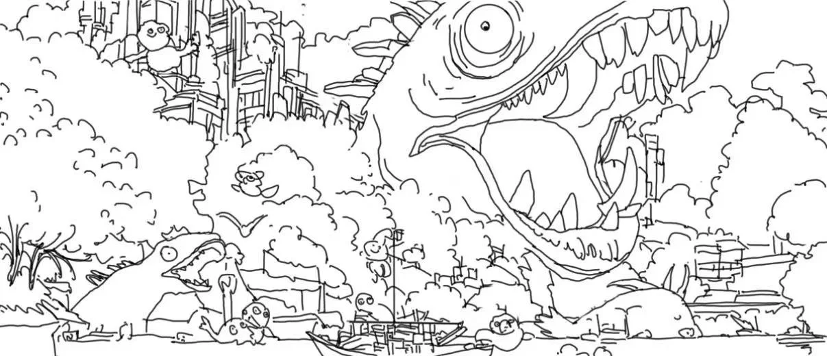 It's inspired by “Where Wild Things Are”. Many monsters get together, centered on the blue cat monster in the middle. They all present an interesting image with their heads turned outwards and their mouths wide open. Above them is a boat belonging to Max - the main character, as well as dense woods and houses.